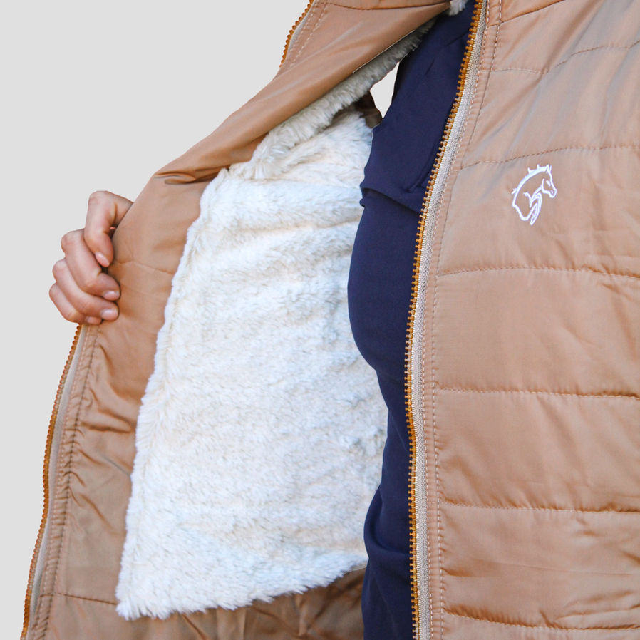 Introducing the Luisa Vest, a must-have for any equestrian wardrobe. This stylish puffer vest boasts comfortable padding and an inner layer of faux fur for ultimate warmth during chilly rides. Made of shiny 100% waterproof material, the new cool colors stand out in any setting. The high collar provides extra protection from the elements, while the side pockets offer convenient storage for small essentials. For women, the cut is pinched at the waist for a flattering fit that looks as good as it feels. Whether you're in the ring or out on the trails, the Luisa Vest is the perfect choice for any equestrian enthusiast.